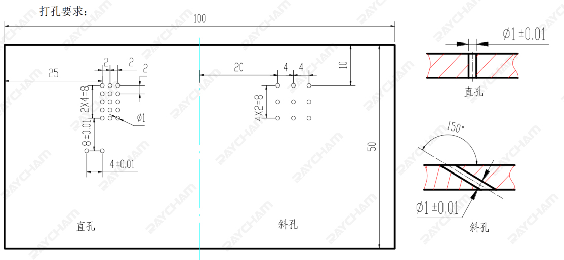 直孔:共計(jì) 17 個(gè),其中 4±0.01mm 尺寸為測試機(jī)床精度,按 0.01mm 要求控制,其余位置精度不做嚴(yán)格控制。孔徑均按 1±0.01mm 控制。