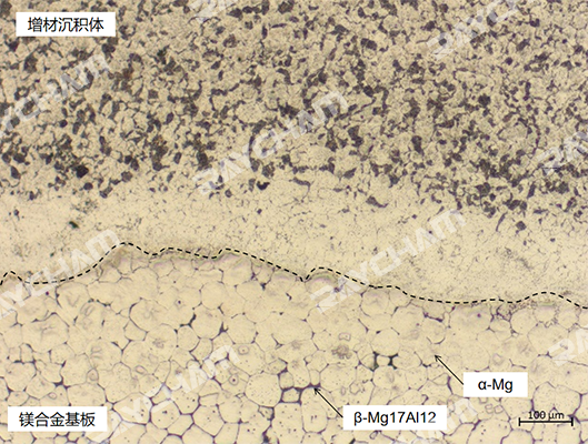 金相觀察結果:顯微組織為離異共晶組織,主要由固溶體α-Mg與晶間離異的共晶β-Mg17Al12相組成,呈不規則分布,主要在晶界附近。在電弧增材特殊的熱輸入影響下,析出的β-Mg17Al12相尺寸、分布與鑄態金屬不同,會有更加細小的α固溶體,同時晶界附近存在細小均勻分布的連續析出β相,產生彌散強化效果,從而提高力學性能。