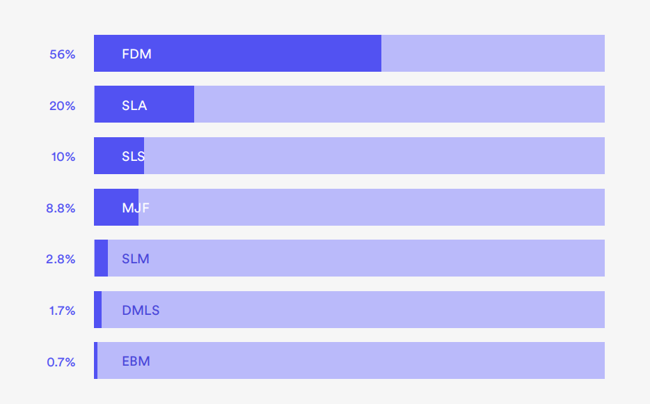 不出所料,FDM(熔融沉積成型)仍然是參與調查的人最常見的選擇,有56%的人表示這是他們最常用的增材制造方法。此外,后處理選項的進步正在幫助推動3D打印的采用。
