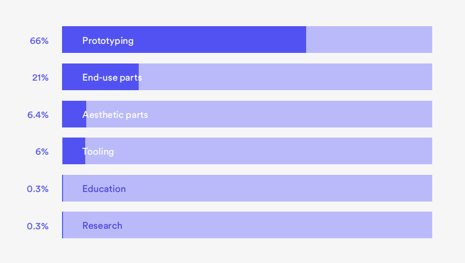 原型制作在全面生產之前開發樣品產品以評估設計和功能是3D打印的第一個真正用途,并且仍然占很大份額。66%的受訪者將其列為3D打印的主要用途。其他關鍵應用包括加工、小批量生產、大規模定制和批量生產。